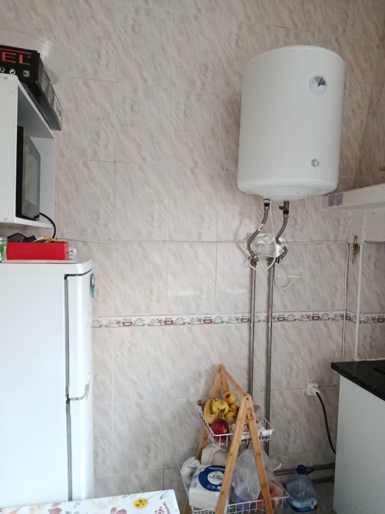 Aqui não conseguimos manter o teto original porque estava muito danificado pela humidade e foi um desafio colocar o teto falso. Também existia um fogão antigo e um esquentador que trocámos por um de vitroceramica que inserimos num móvel para alguma arrumação e um cilindro elétrico.