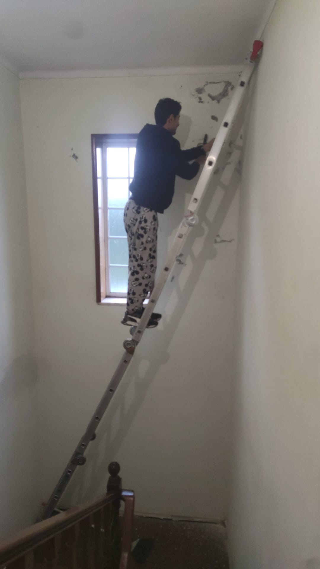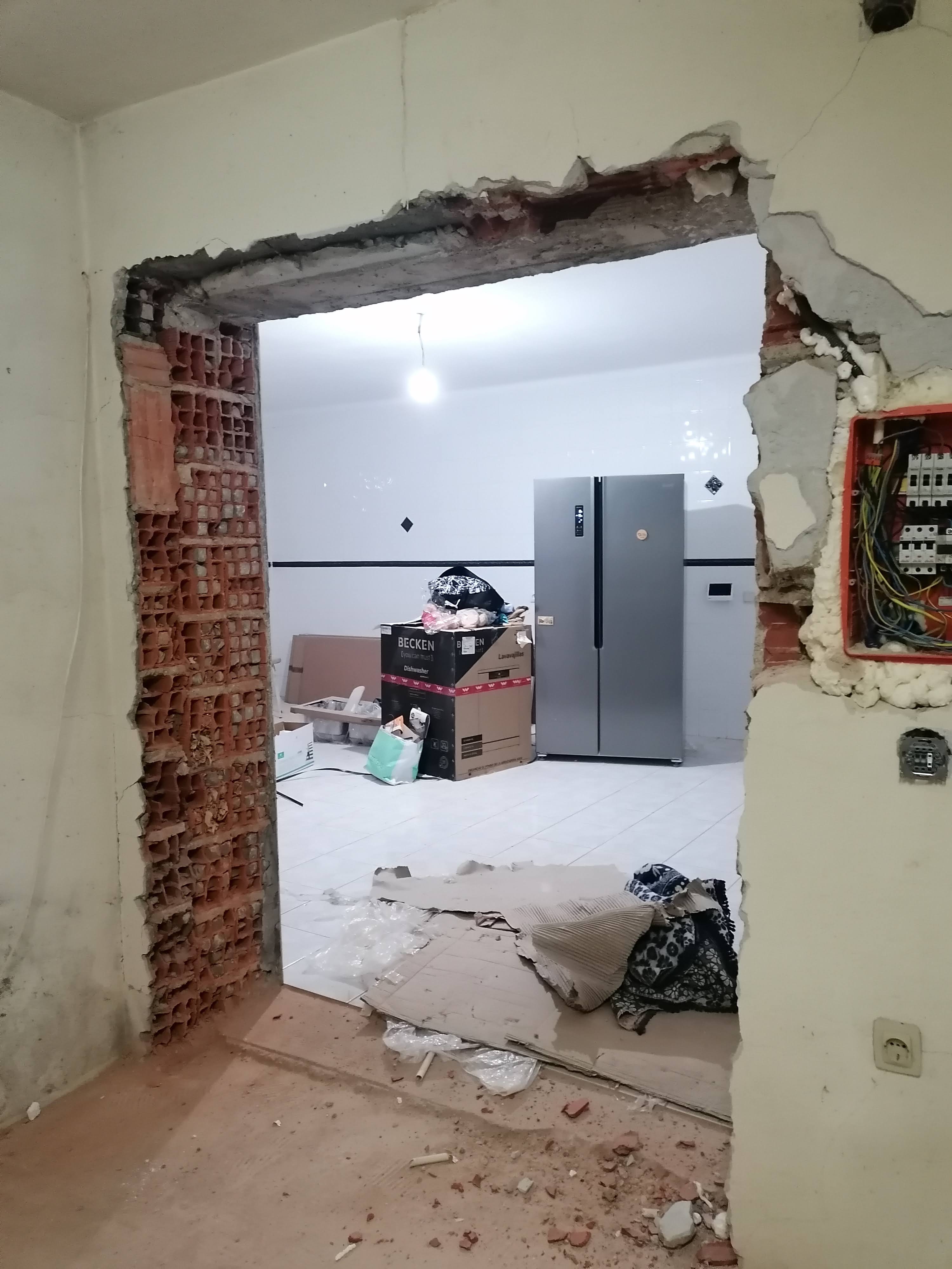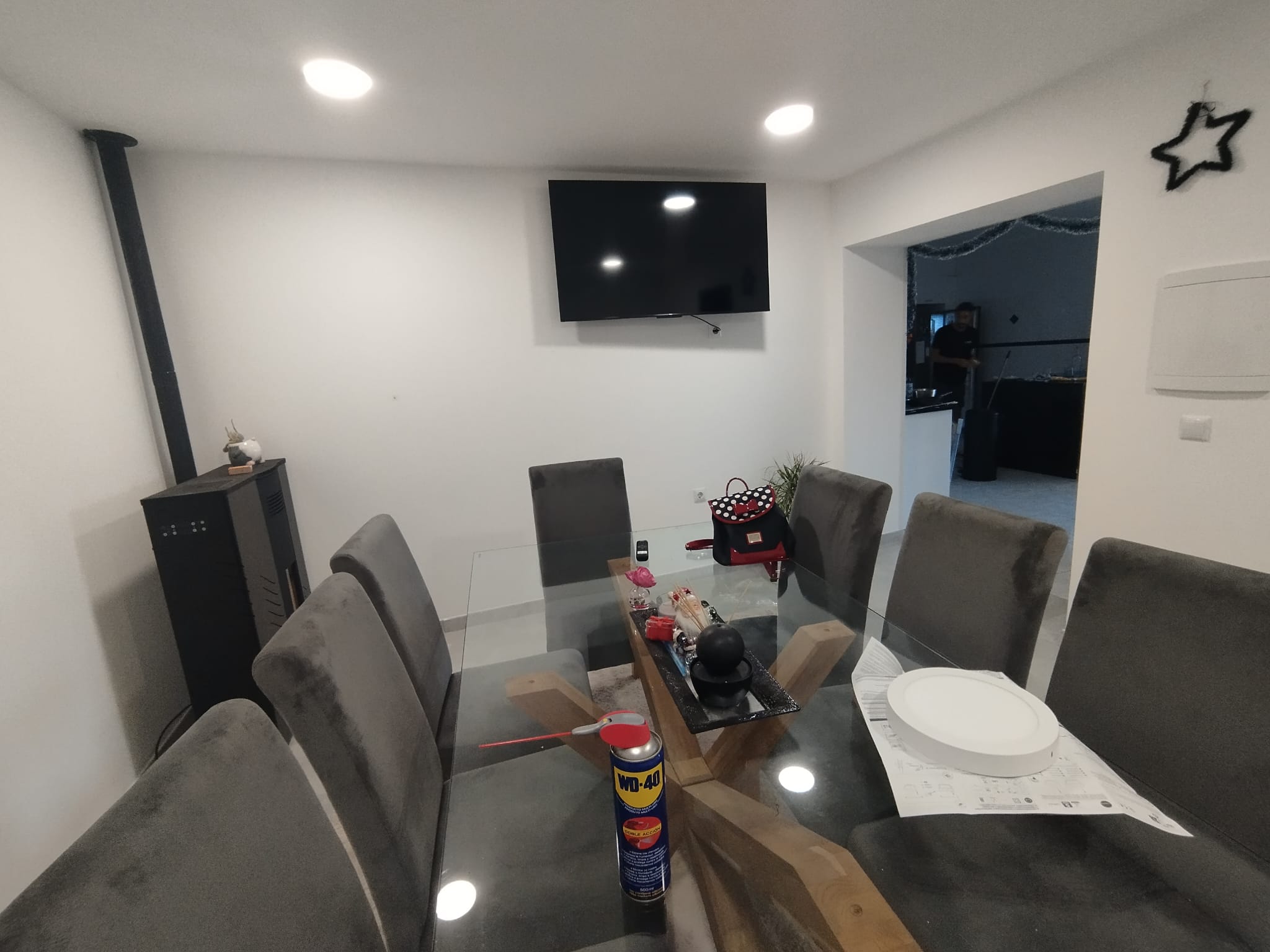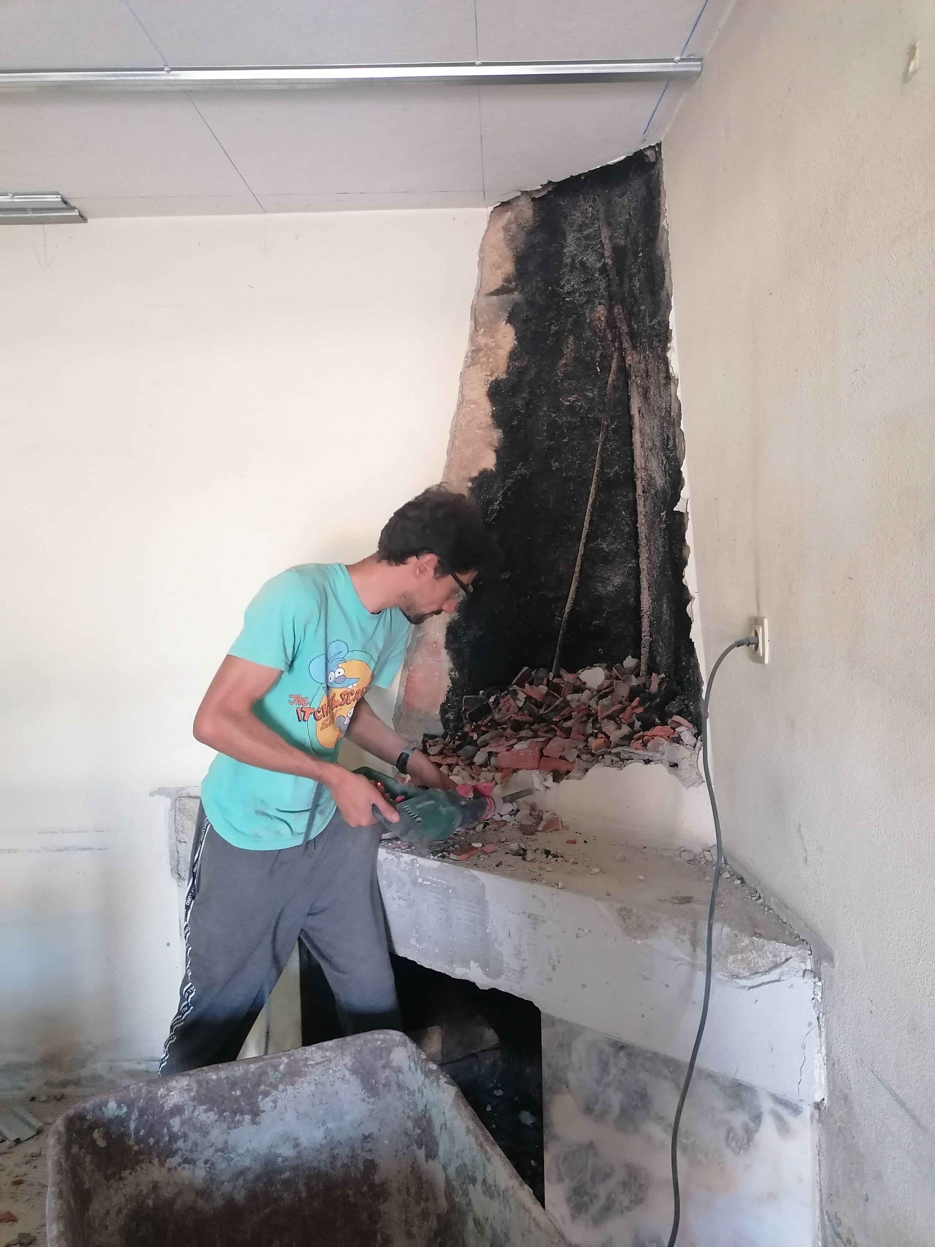 Depois do WC, foi a vez da sala de jantar. Aqui não havia como contornar: tivemos de partir o chão de mosaicos, remover os azulejos das paredes e até destruir a lareira que estava ali há décadas. Cada martelada fazia-nos sentir que estávamos a escrever uma nova história para a casa. O WD-40 entrou na fase final, ajudando a soltar ferragens e portas que insistiam em não ceder. No fim, o espaço estava pronto para receber uma nova sala de jantar, limpa, aberta e cheia de luz.