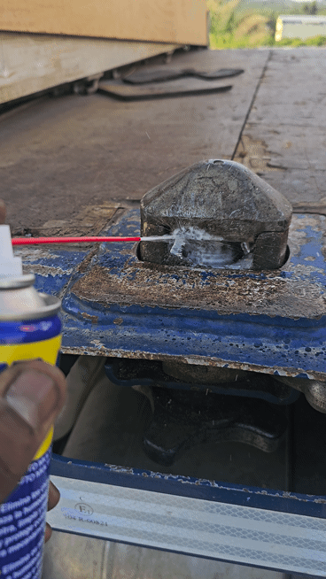 Pino Lock para transporte de contentores marítimo enferrujado. Através do wd40 o equipamento voltou a funcionar corretamente facilitando o serviço.