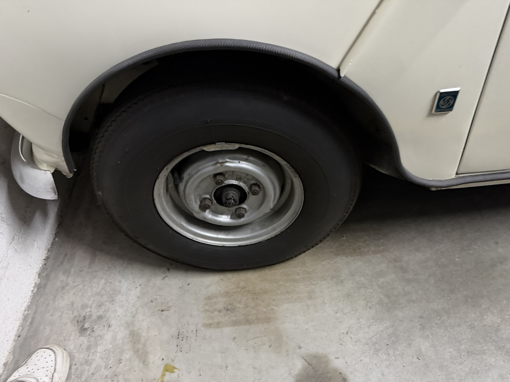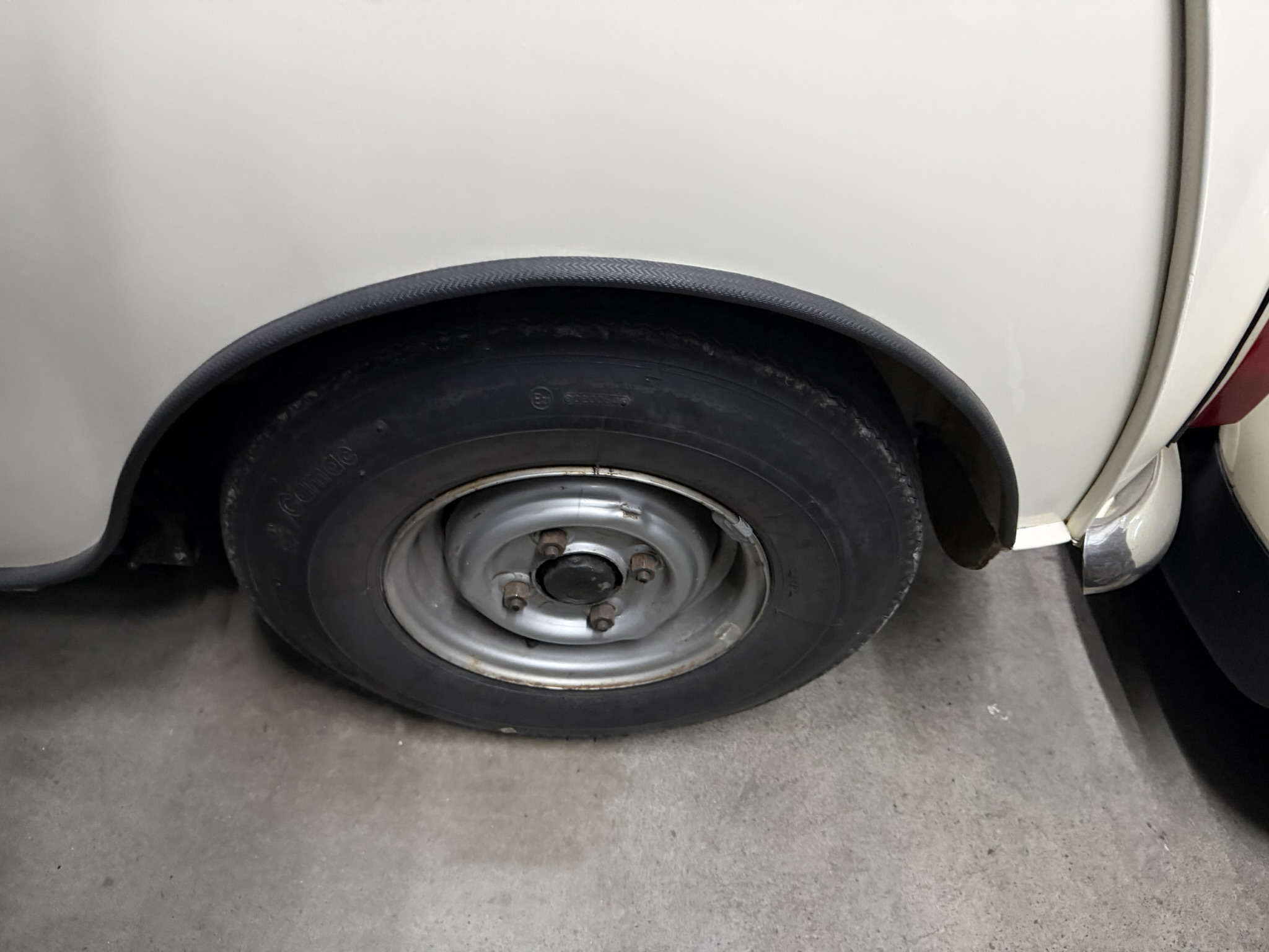 Na altura em que comprámos o carro de volta decidimos comprar uns pneus que imitavam os pneus da altura de forma a manter a estética do mesmo, num entanto estes pneus não têm muita segurança na estrada e após apenas 1 mês parados começam a deformar-se. Logo decidimos que deveríamos trocar os mesmo comprometendo um pouco a estética de forma a tornar o carro um pouco mais seguro.
