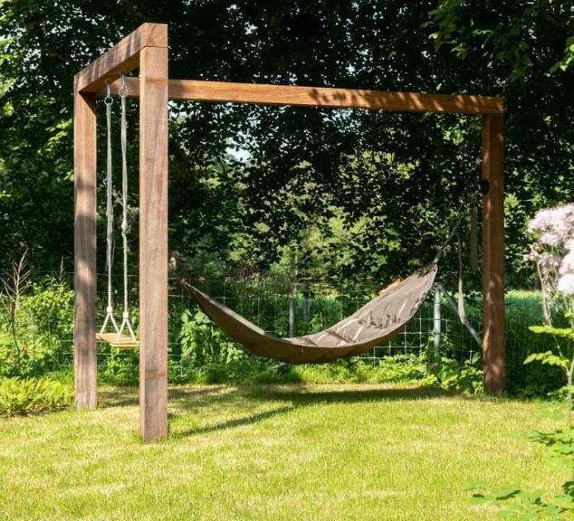 Um recanto especial será marcado pela instalação de uma pérgula moderna em madeira, com um baloiço e uma rede suspensa, ideal para relaxar ou conviver em família.