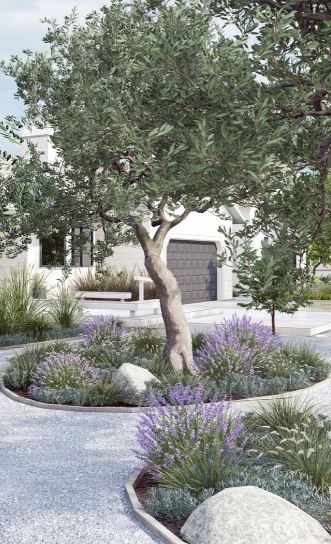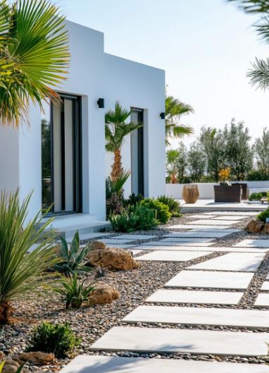 Caminhos com blocos de cimento intercalados com gravilha trarão ritmo e leveza ao espaço, criando um contraste estético agradável.