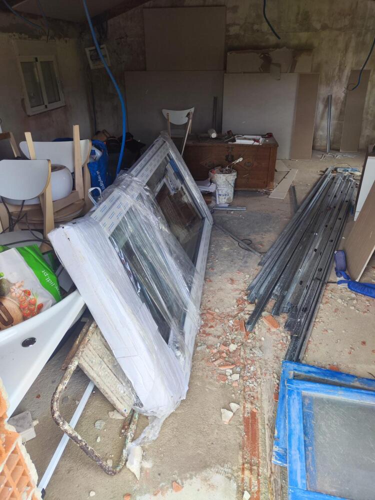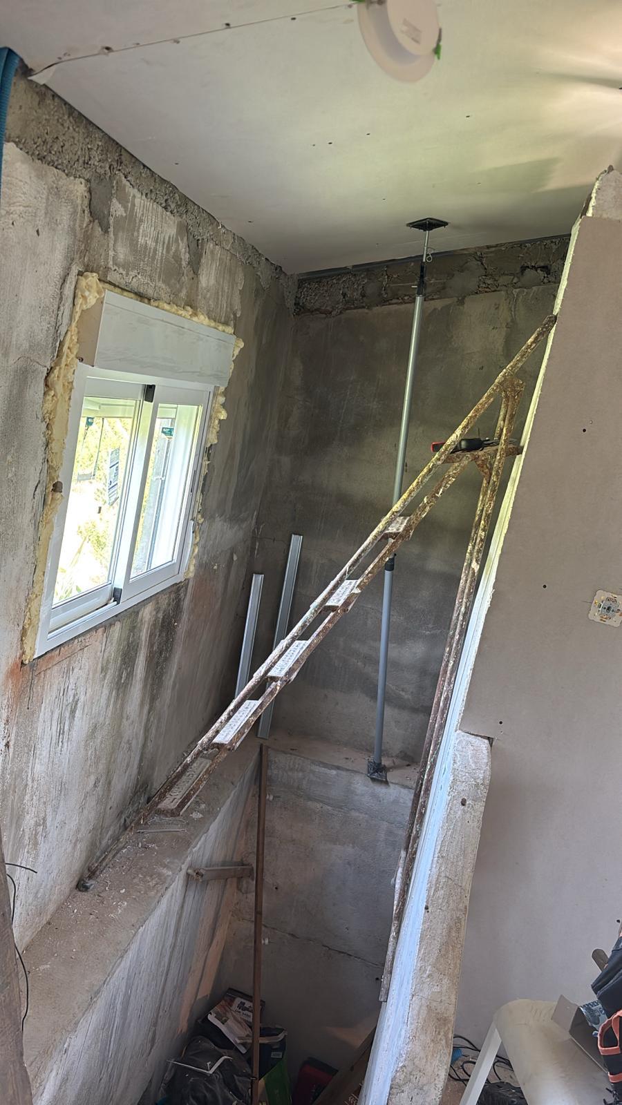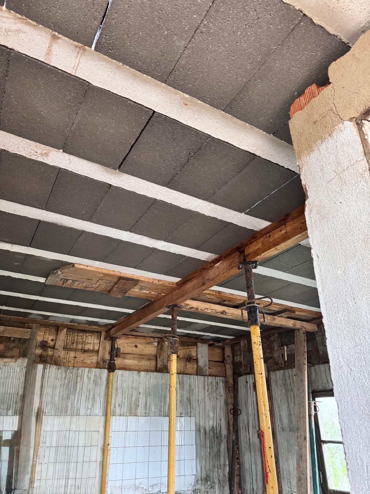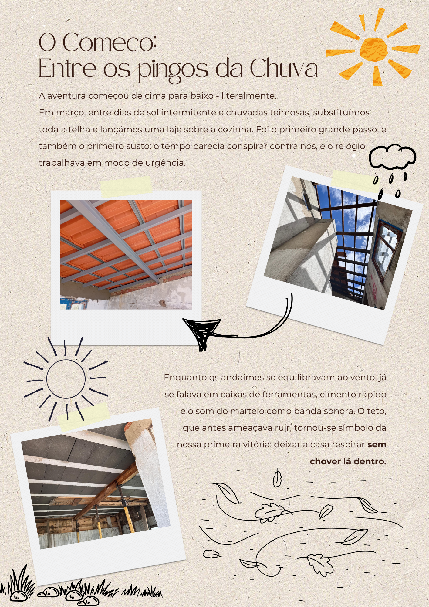 Em março, entre dias de sol intermitente e chuvadas teimosas, substituímos toda a telha e lançámos uma laje sobre a cozinha. Foi o primeiro grande passo, e também o primeiro susto: o tempo parecia conspirar contra nós, e o relógio trabalhava em modo de urgência.