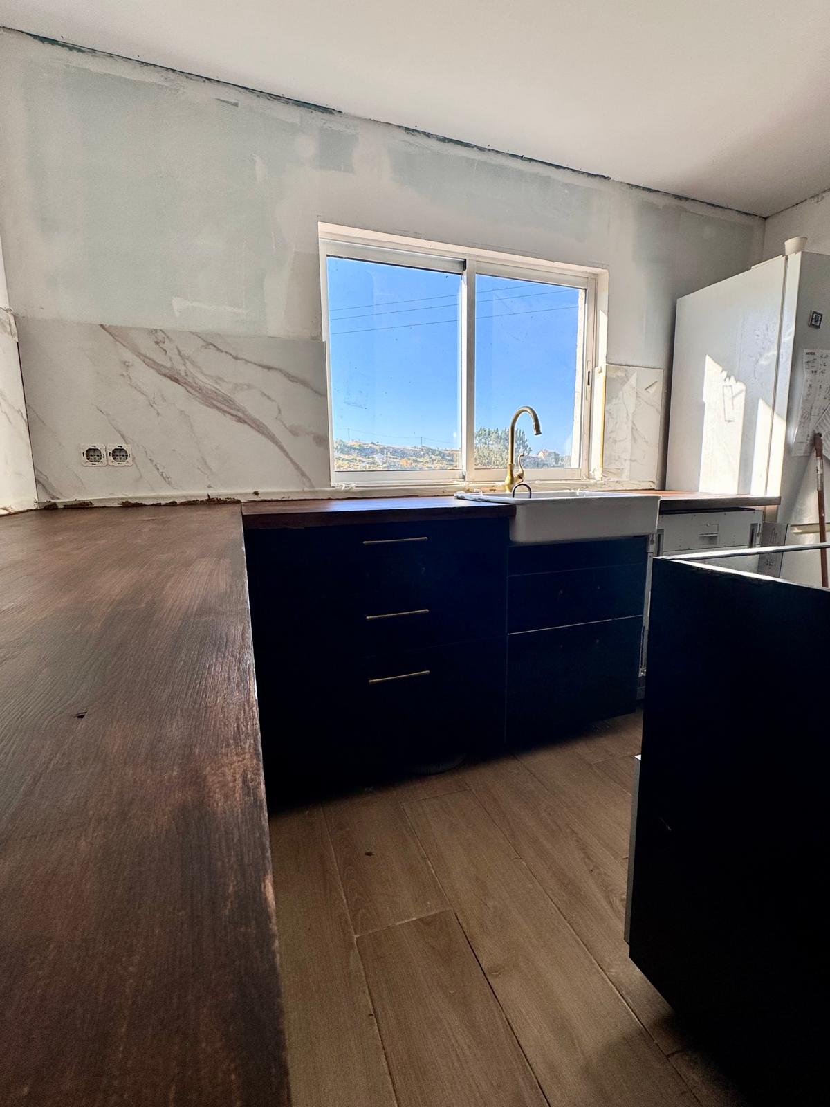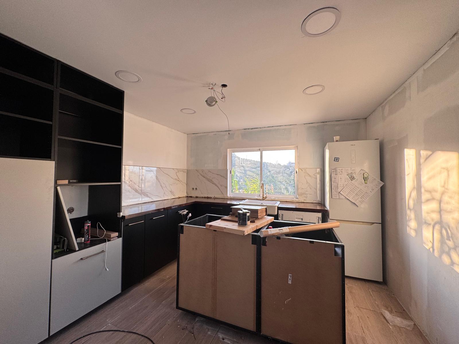 A seguir, foi a vez da cozinha — o espaço mais crítico, o epicentro das rotinas e o mais difícil de conciliar com o caos da remodelação.