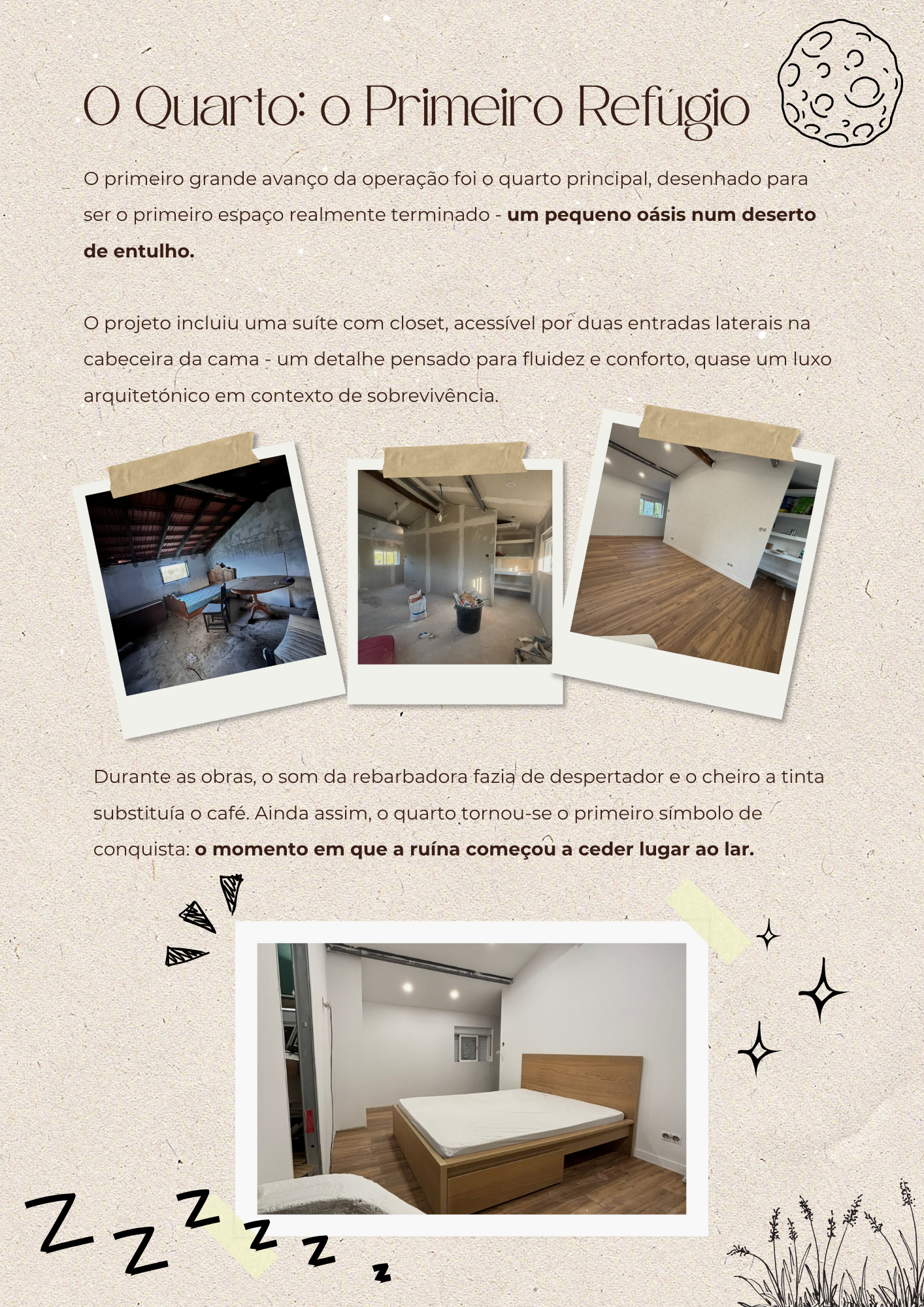 Durante as obras, o som da rebarbadora fazia de despertador e o cheiro a tinta substituía o do café. Ainda assim, o quarto tornou-se o primeiro símbolo de conquista: o momento em que a ruína começou a ceder lugar ao lar.