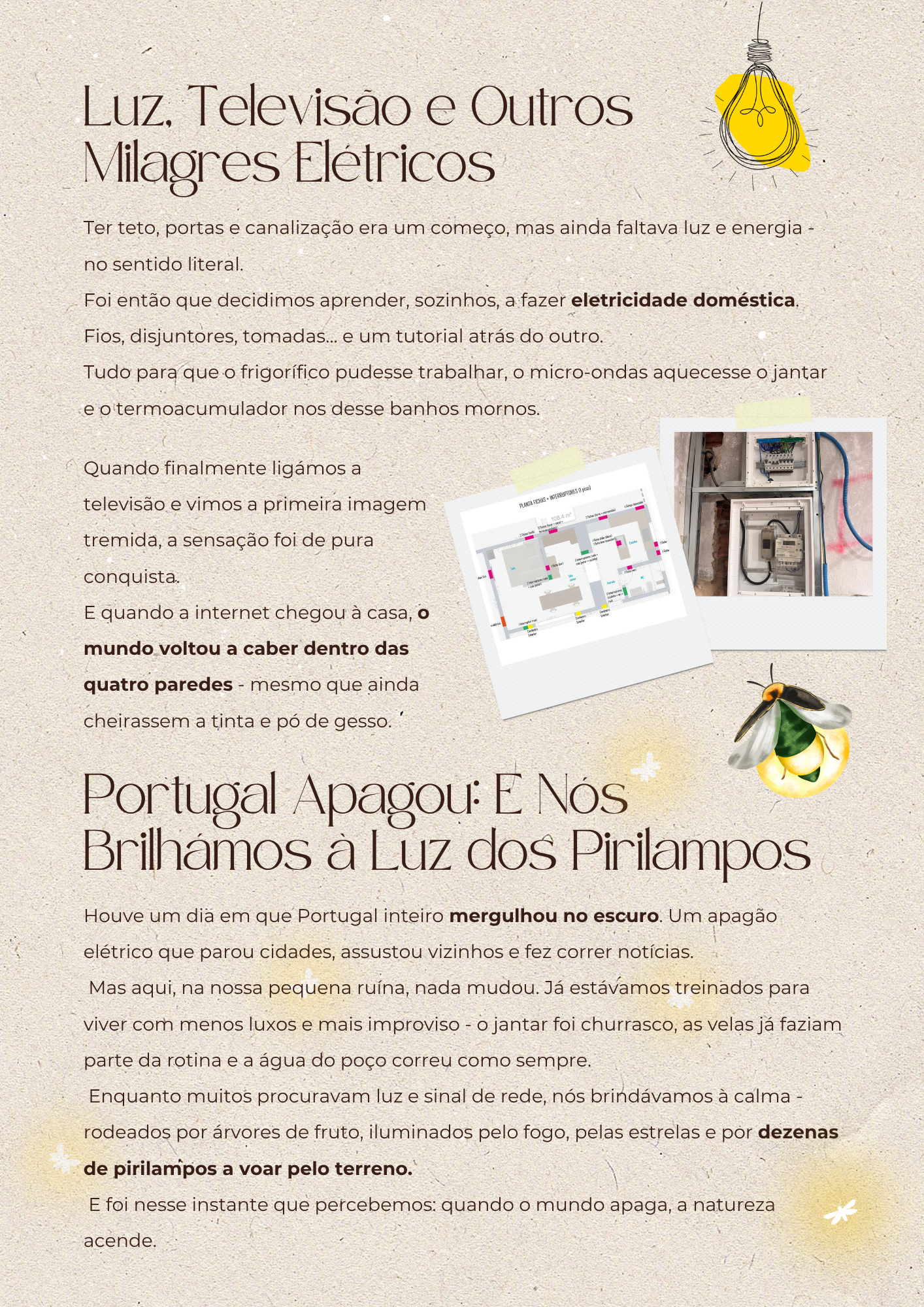 Mas aqui, na nossa pequena ruína, nada mudou. Já estávamos treinados para viver com menos luxos e mais improviso - o jantar foi churrasco, as velas já faziam parte da rotina e a água do poço correu como sempre.