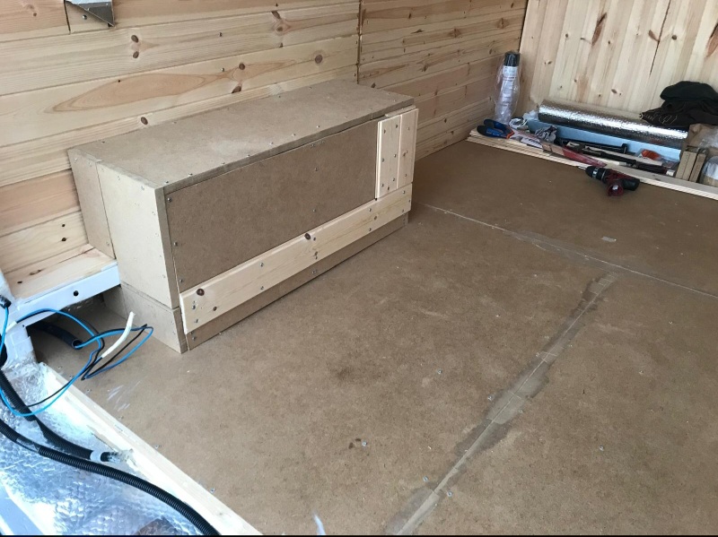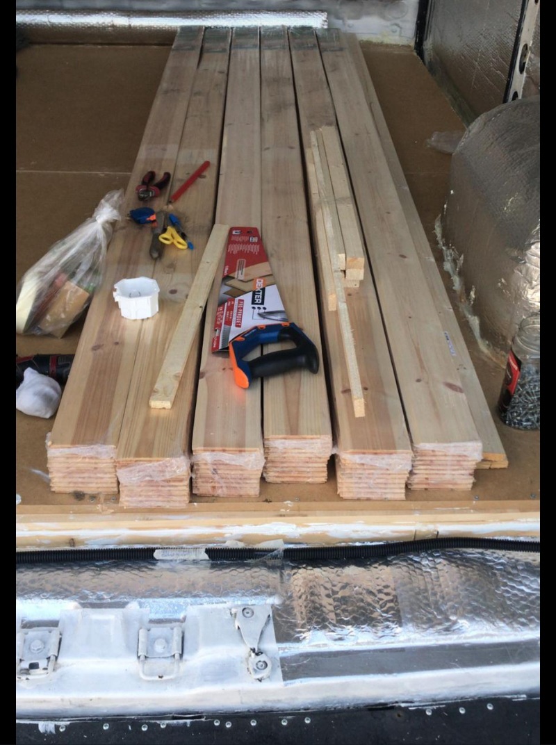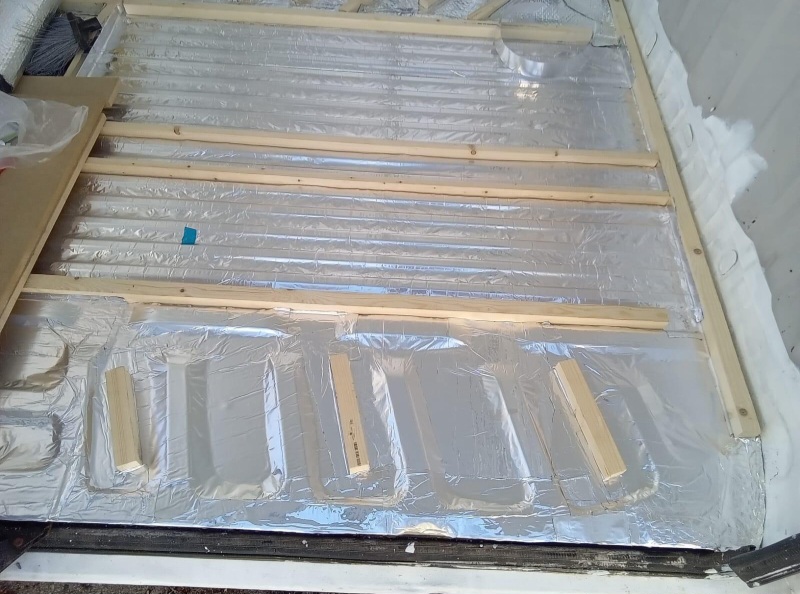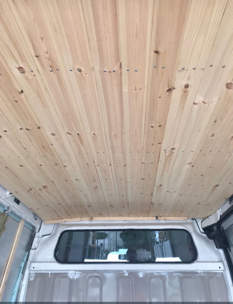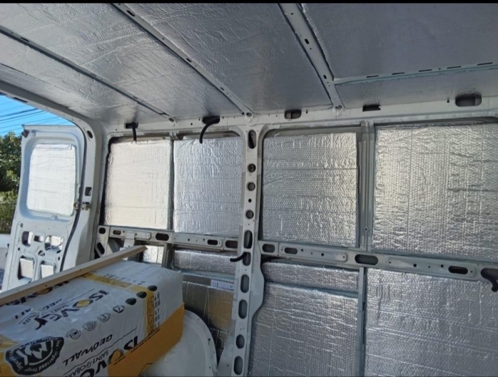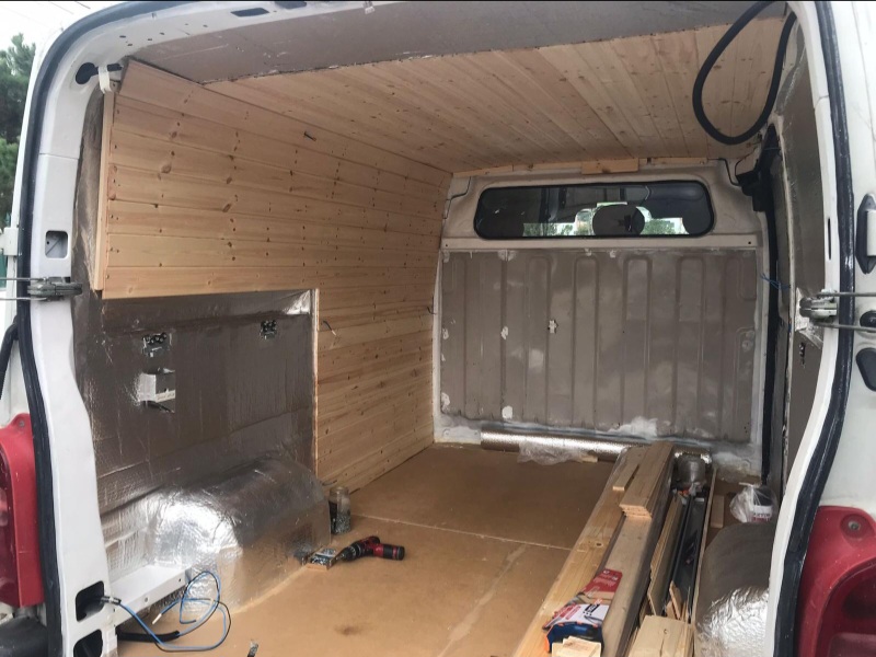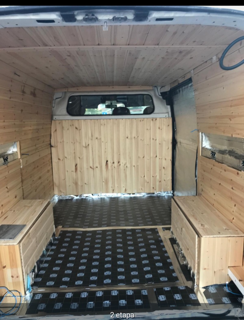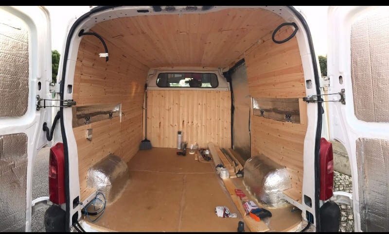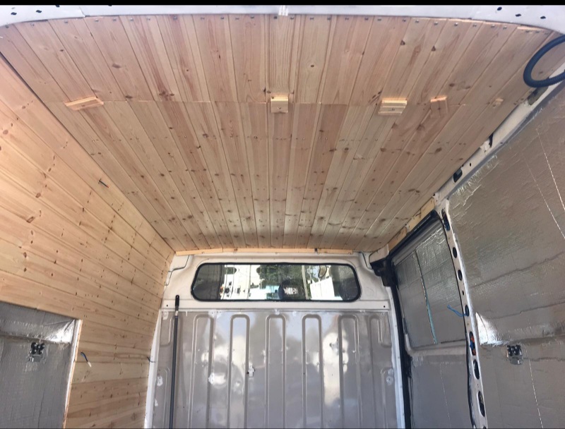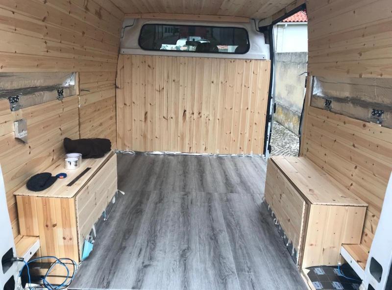 Fiz a parte de isolamento térmico, piso, paredes, laterais e teto em madeira e a parte elétrica não fiz por dois fatores. Primeiro pela falta de material (toda parte elétrica, painéis solares, baterias e etc) e a falta de conhecimento. Decidi parar o projeto até conseguir contratar uma empresa que faça a parte elétrica com os equipamentos necessários para um MotorHome.