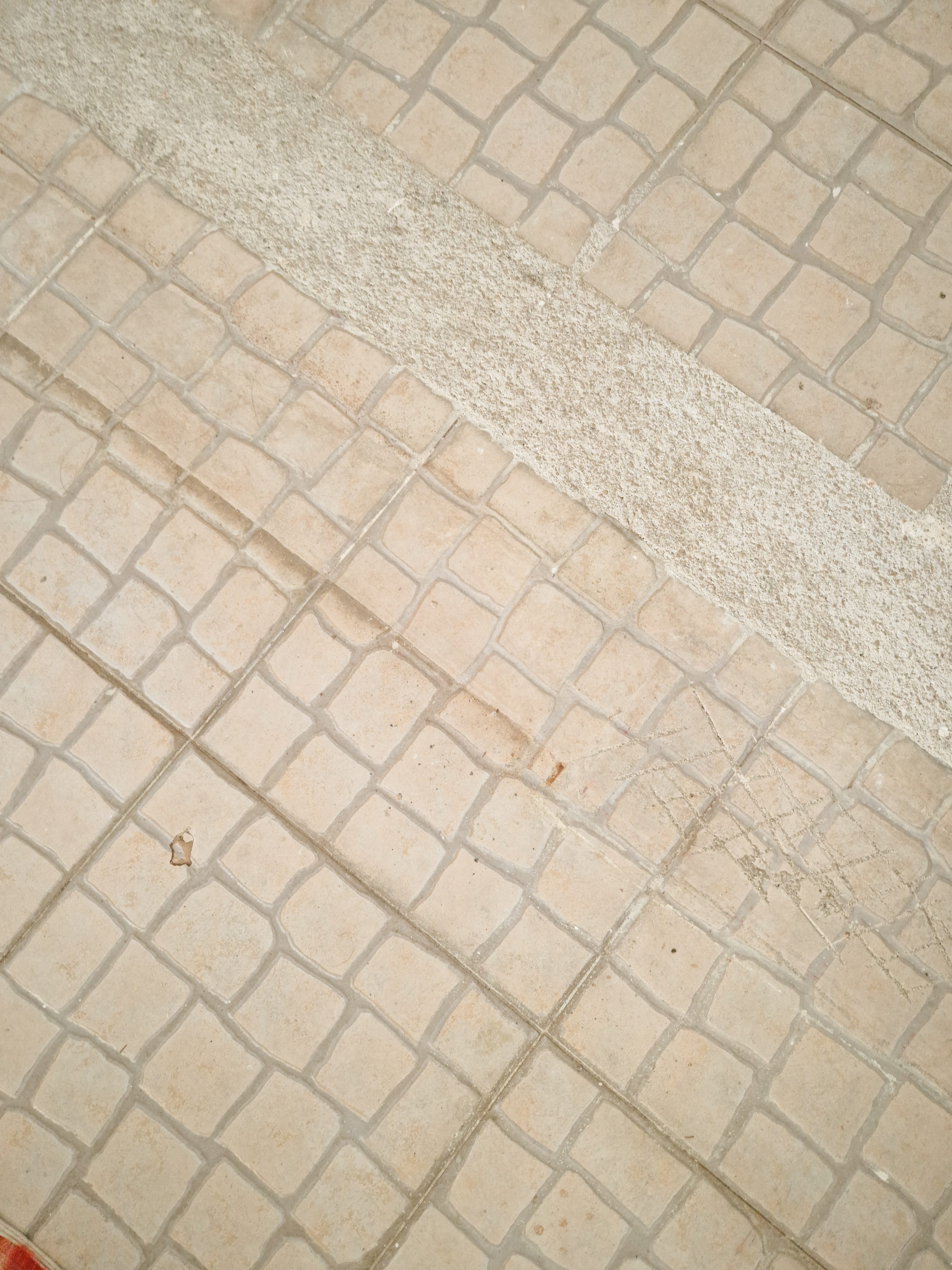 O chão atual tem um padrão que já não conversa com o estilo da cozinha. Além disso, já mostra sinais de desgaste.
