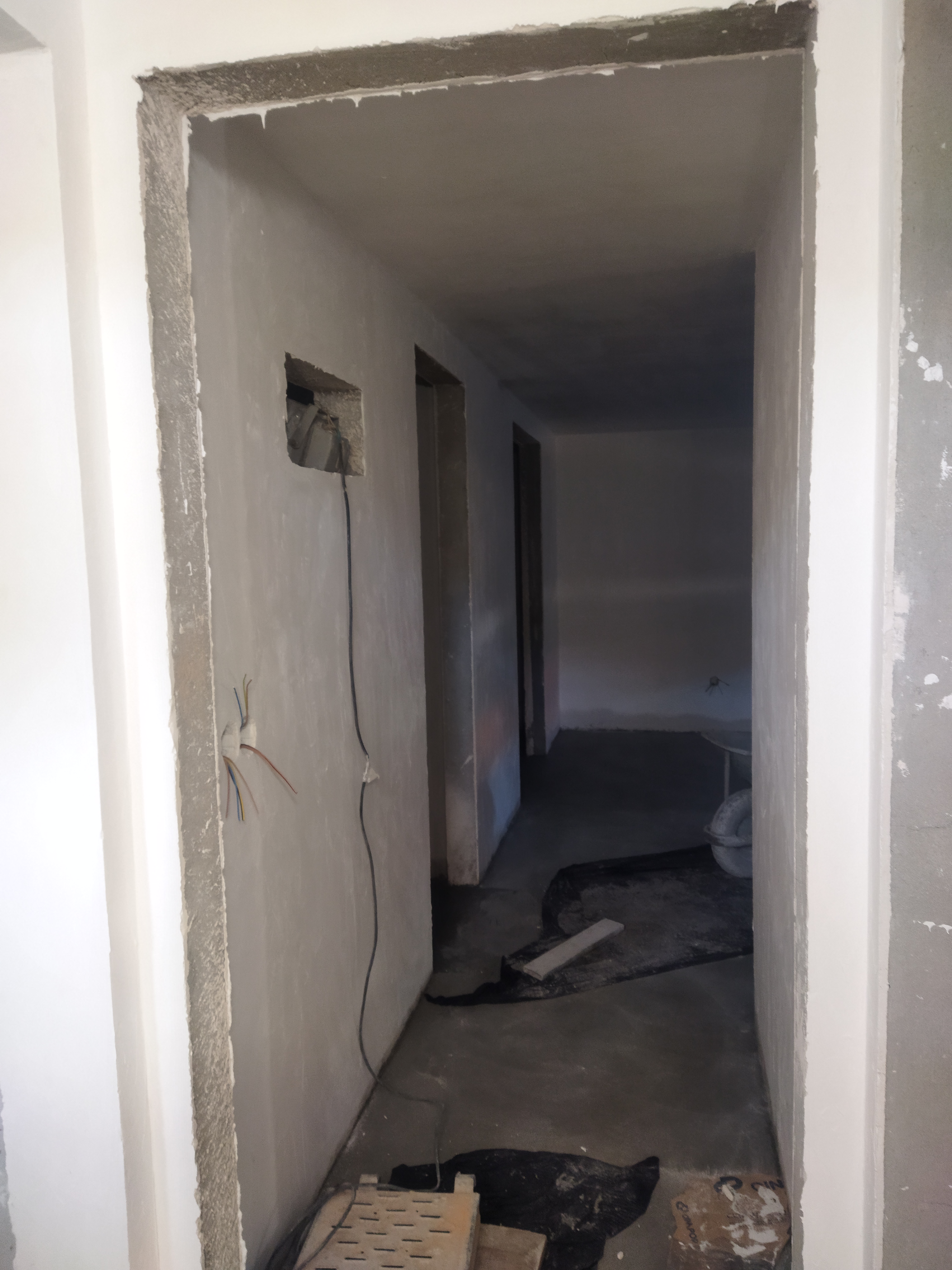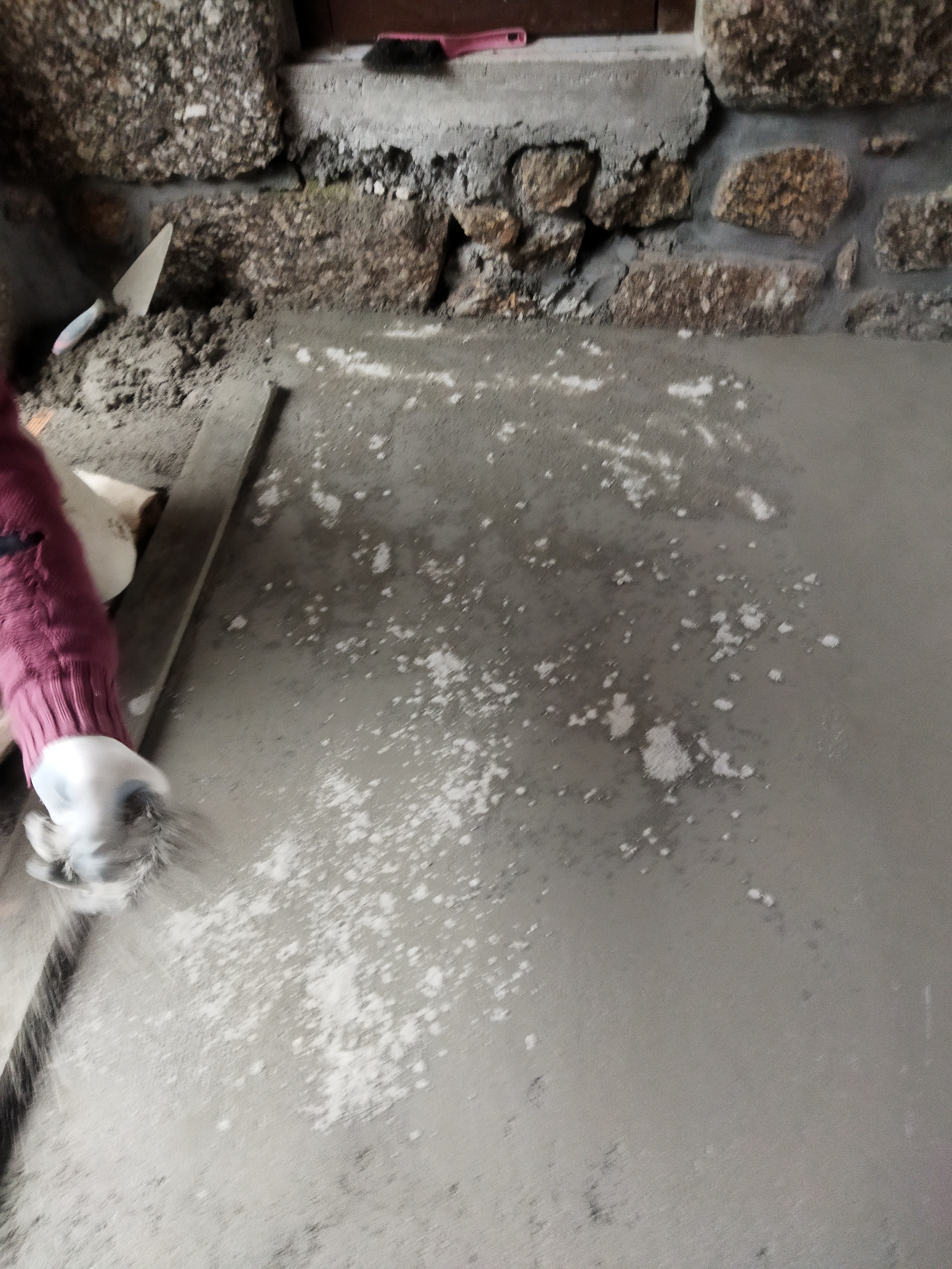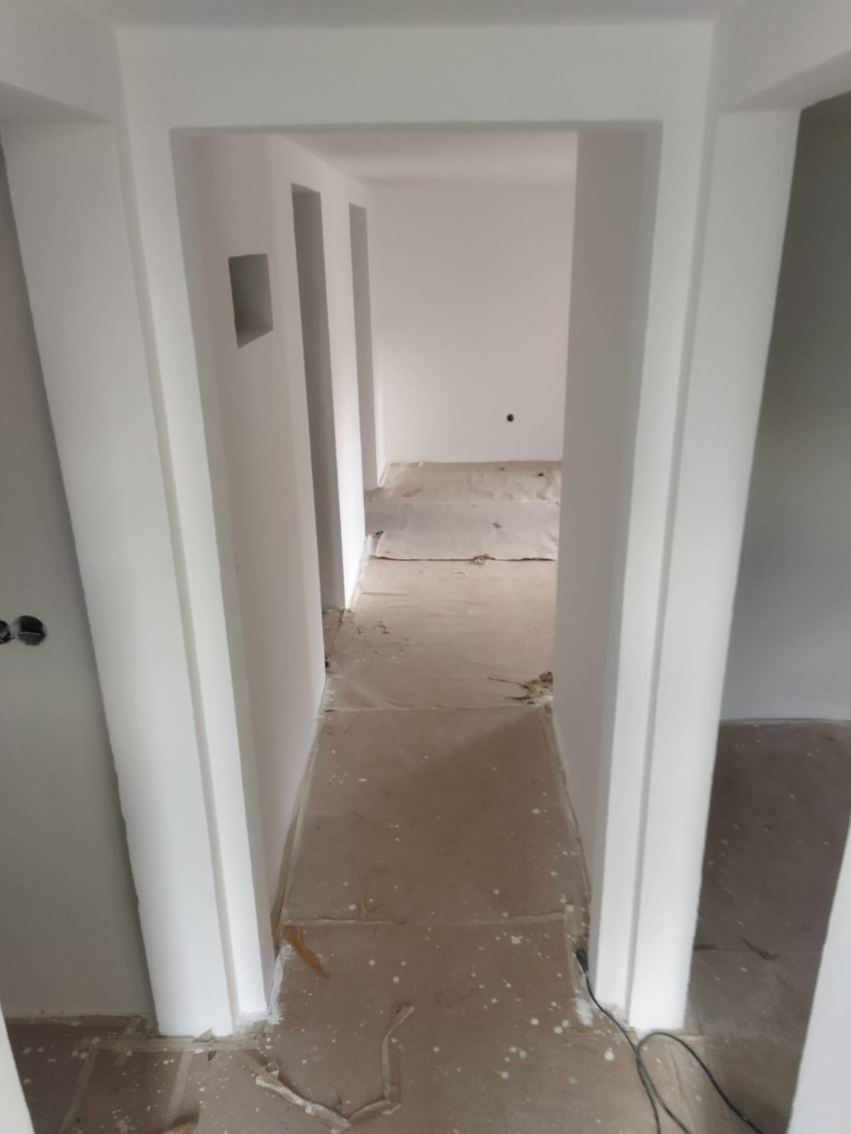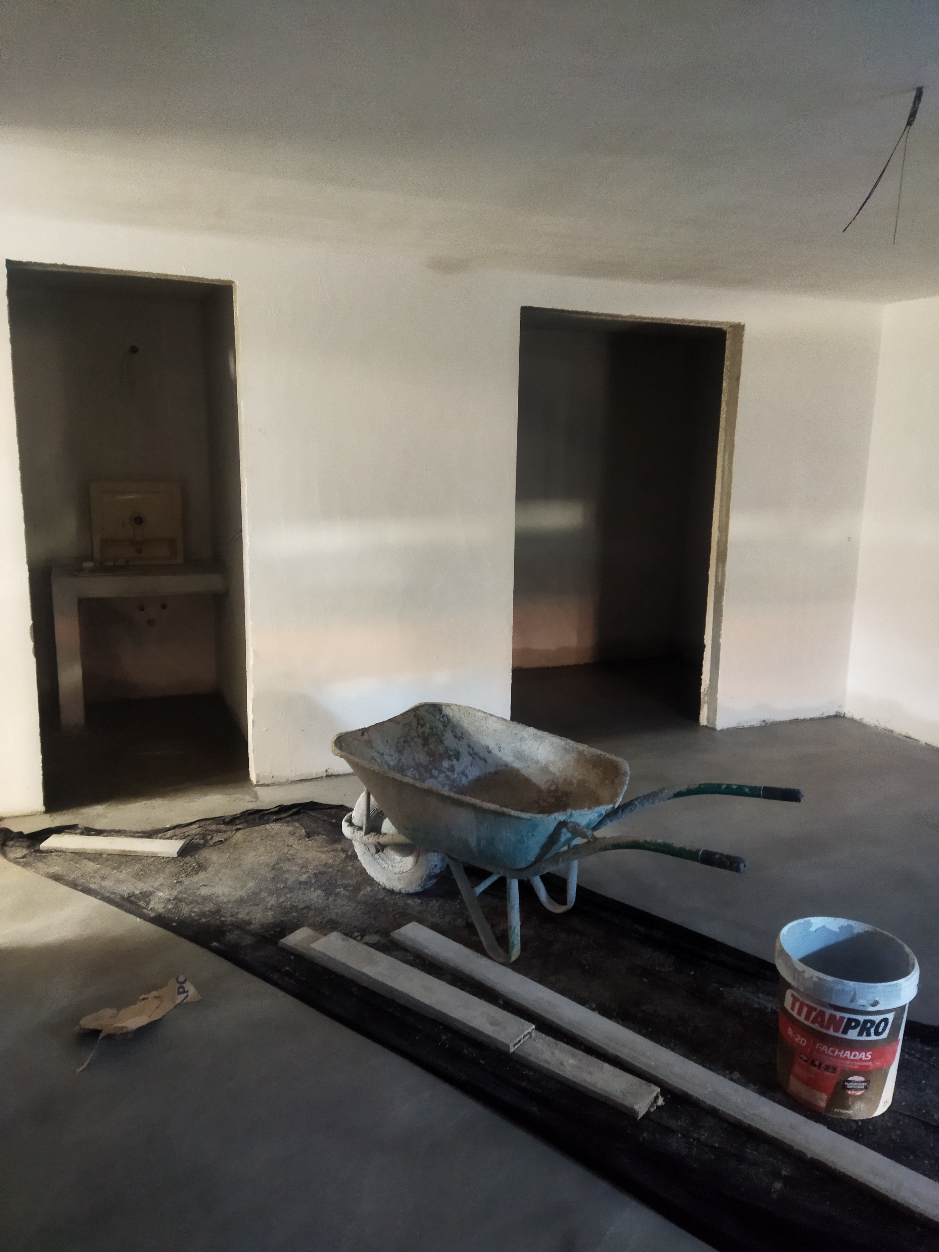 Pintura das paredes interiores, envernizamento do chão, colocação das louças dos WCs e banca de mámore da cozinha.