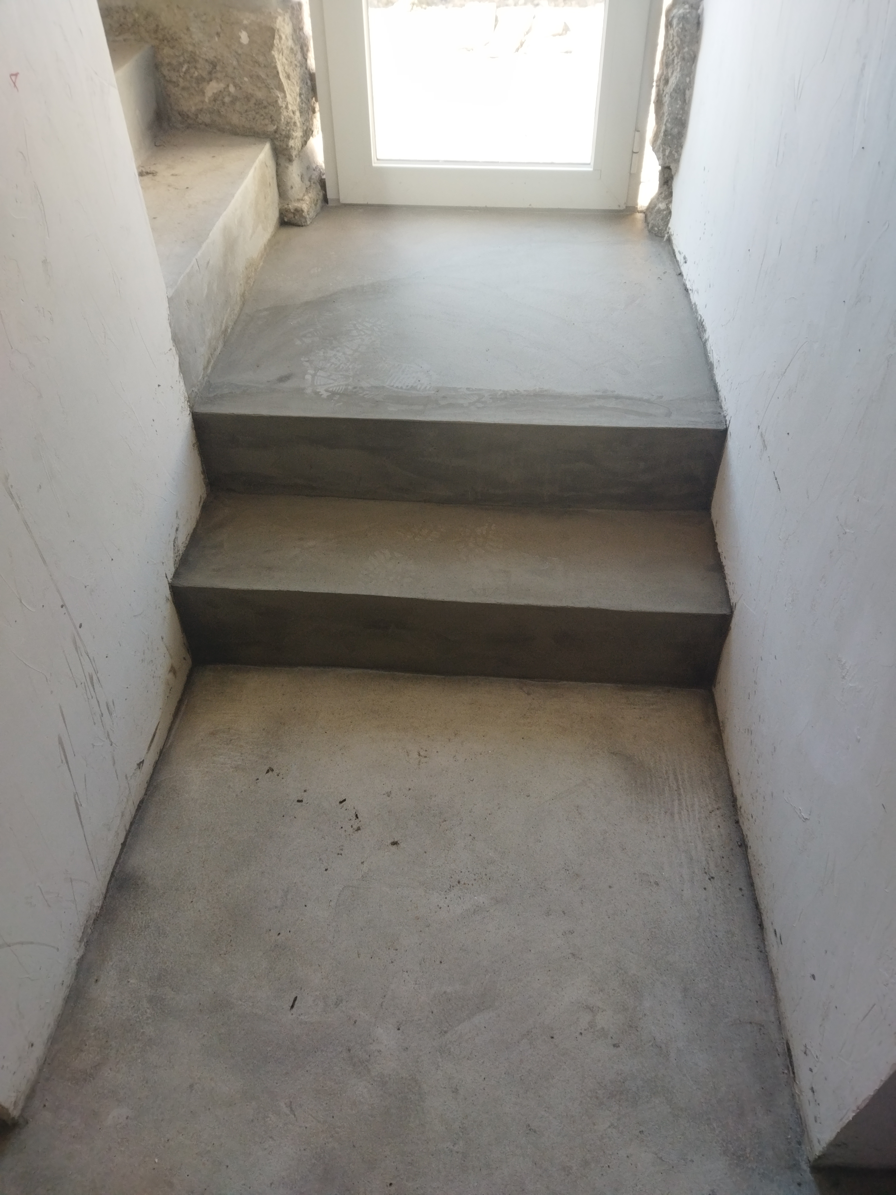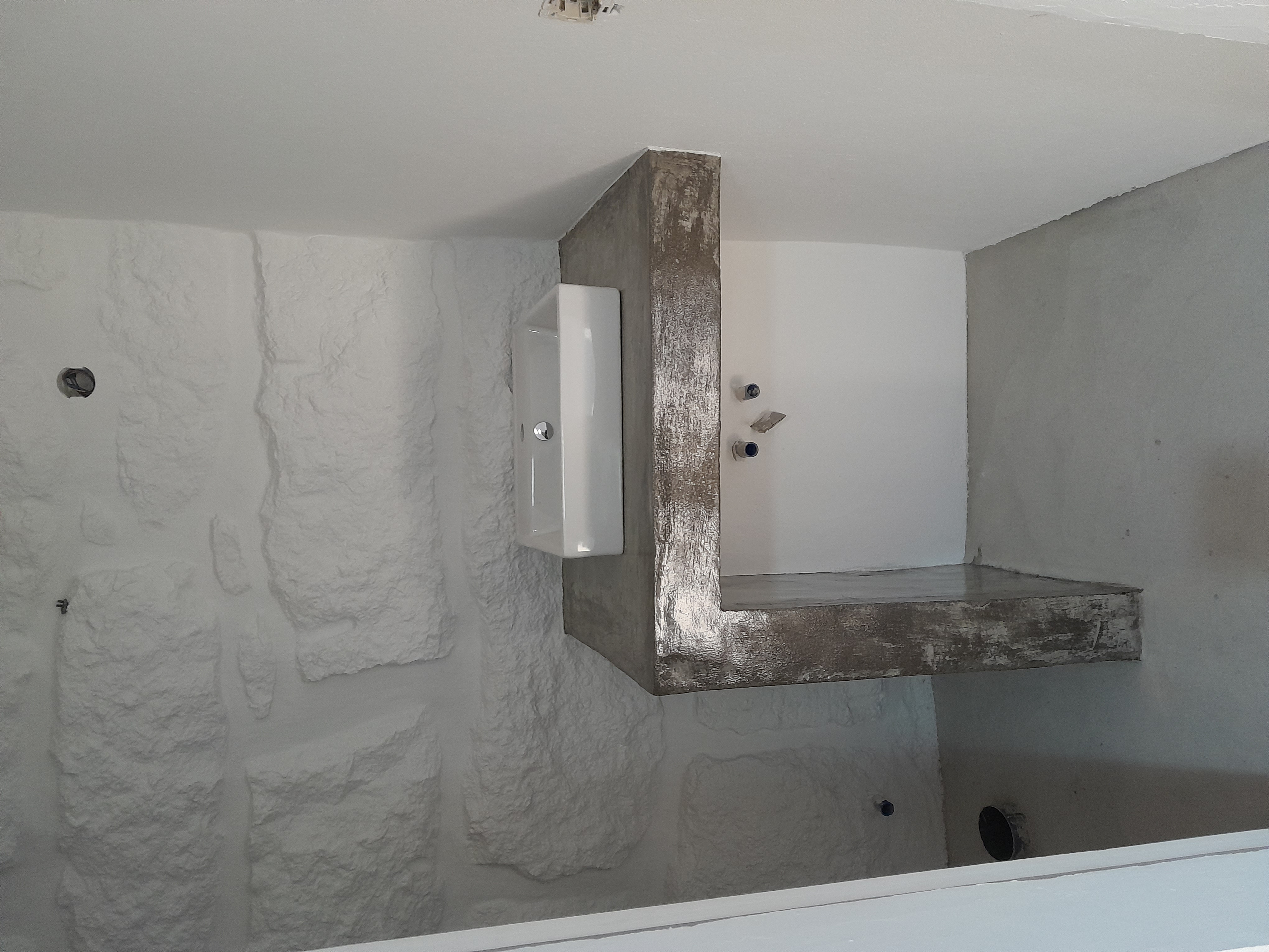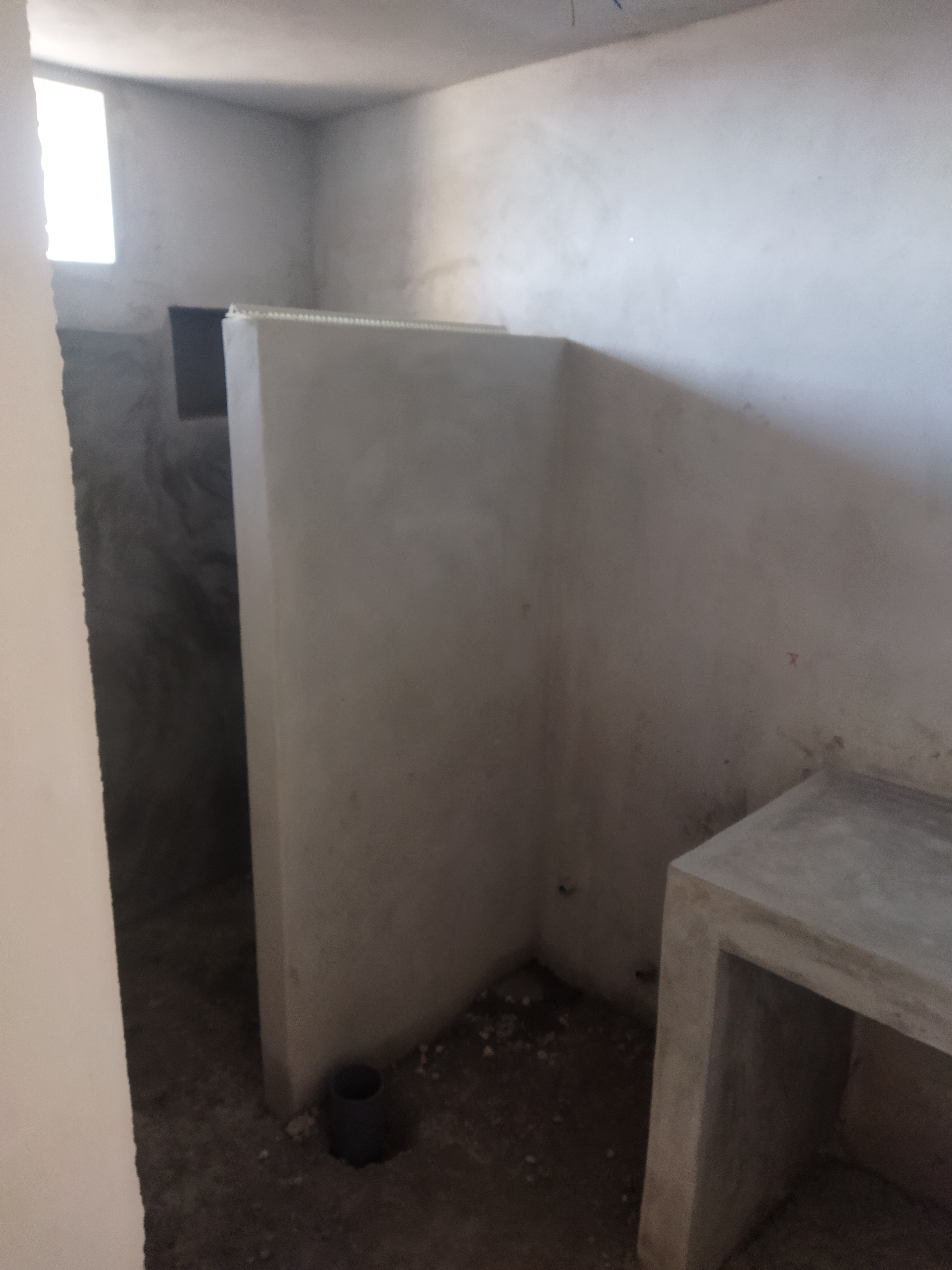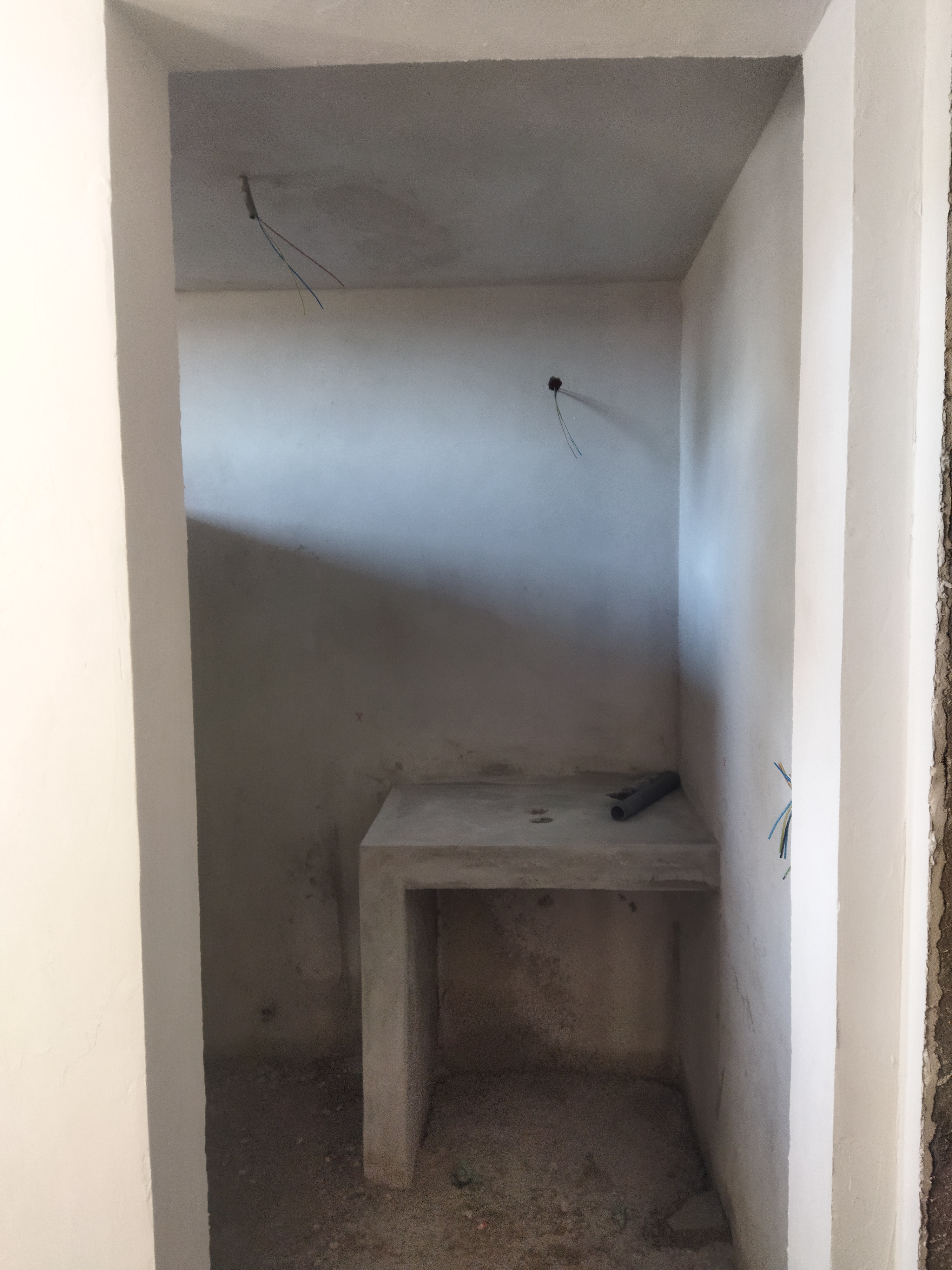 Pintura das paredes interiores, envernizamento do chão, colocação das louças dos WCs e banca de mámore da cozinha.