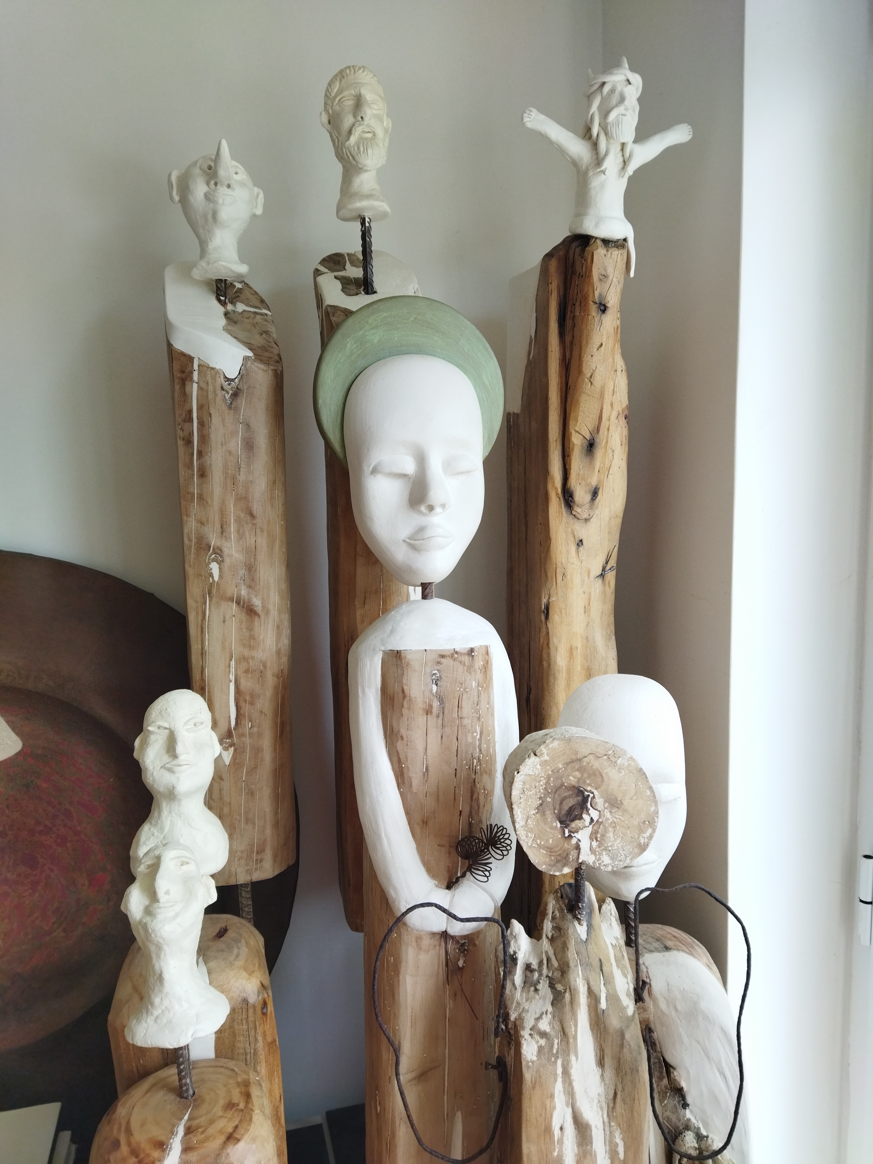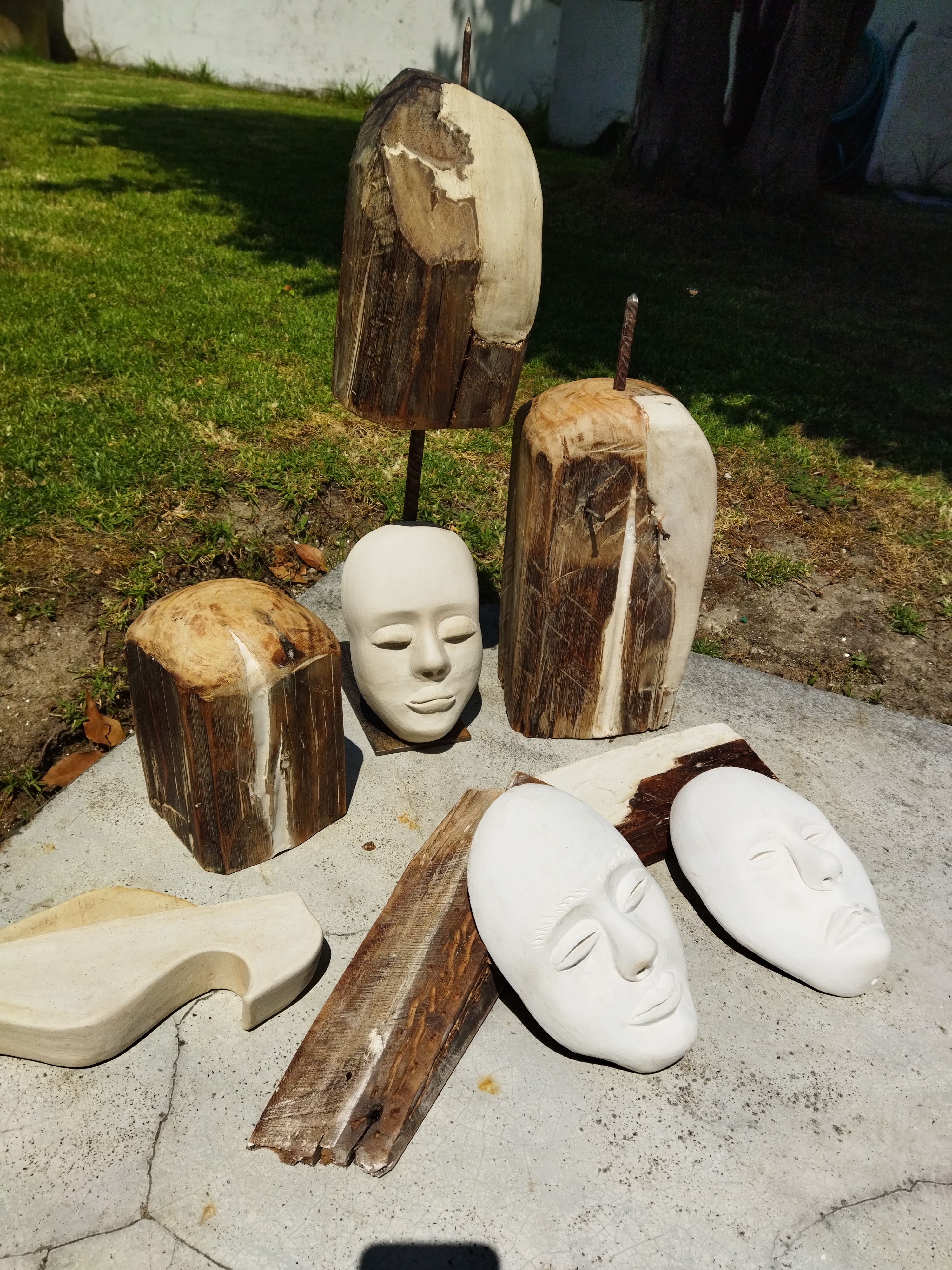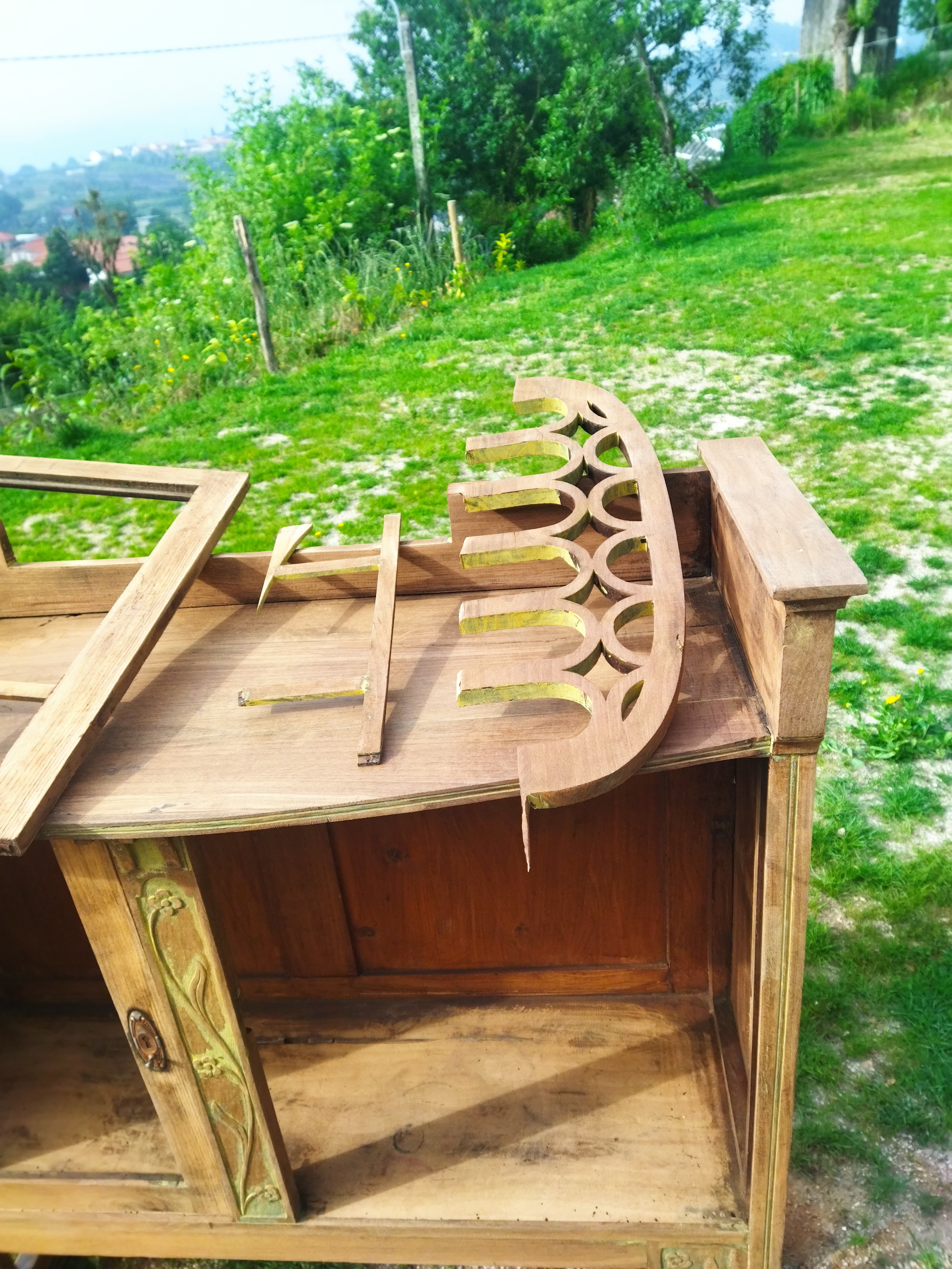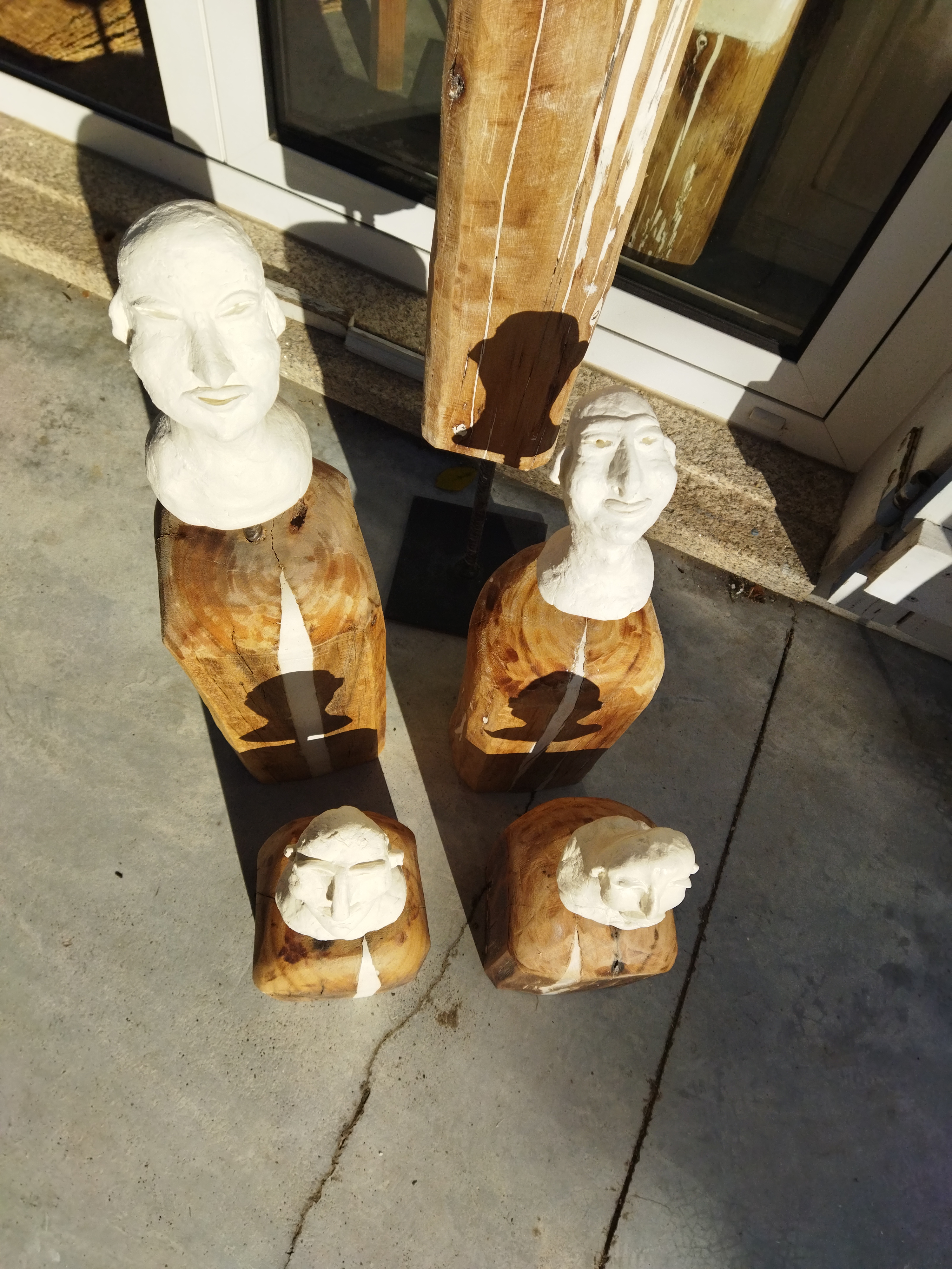 Exemplos de recuperação de alguns móveis que se encontram espalhados pela casa e de algumas das esculturas que fizemos com as velhas traves do telhado.