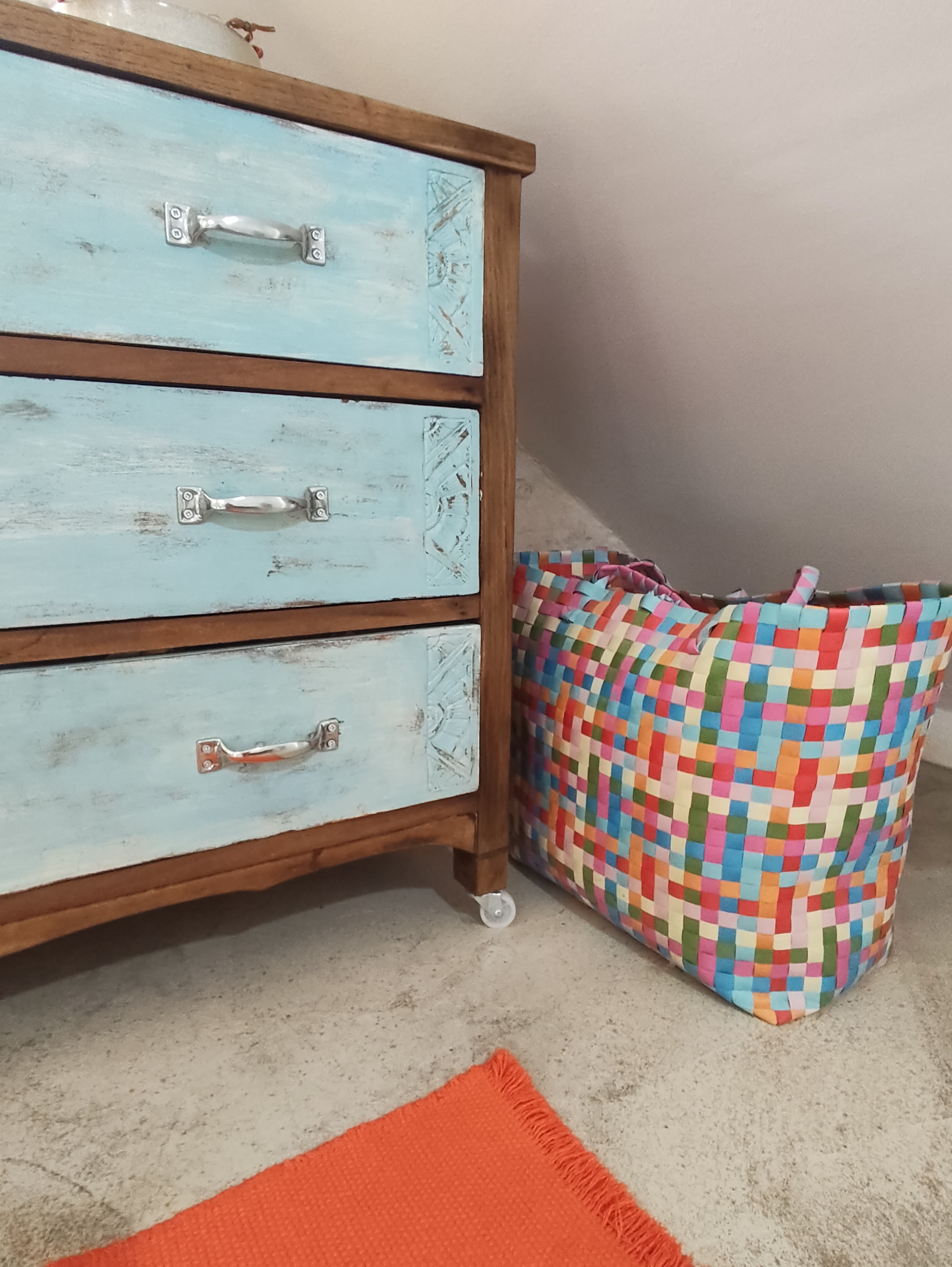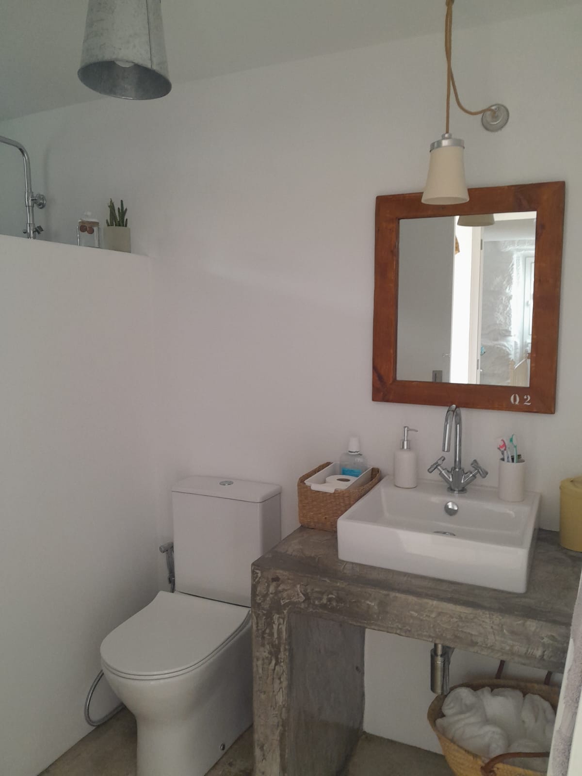 Nada foi deitado fora. As portadas das janelas velhas foram lixadas, tratadas e voltaram ao sítio onde sempre tinham estado (claro que isto só foi possível graças ao nosso velho aliado, o WD-40. Bastava aplicar um pouco, esperar, e o milagre acontecia — o metal voltava a mover-se, a respirar). As portas velhas foram reaproveitadas para as portadas que faltavam ou transformadas em mesas. As traves da casa que tiveram de ser retiradas deram vida a esculturas e serviram para fazer candeeiros de mesa. Algumas madeiras mais finas serviram também para cabides e molduras de espelhos. Não há decoração em canto nenhum desta casa que não seja feita com o que já existia — reciclado, reinventado, revalorizado.