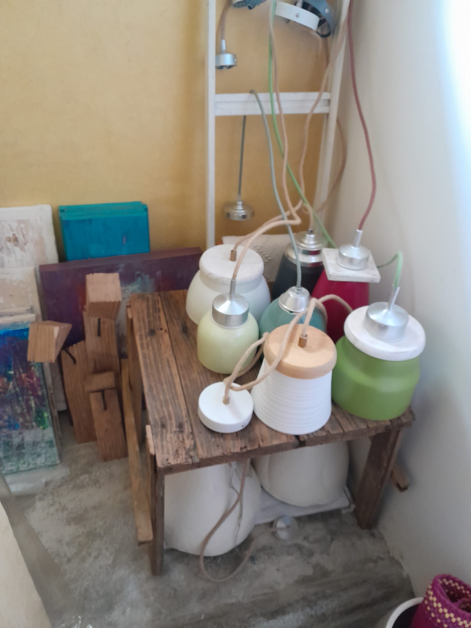 4_Construção de candeeiros em barro, com vasos, filtros de café metálicos e formas de bolos.
