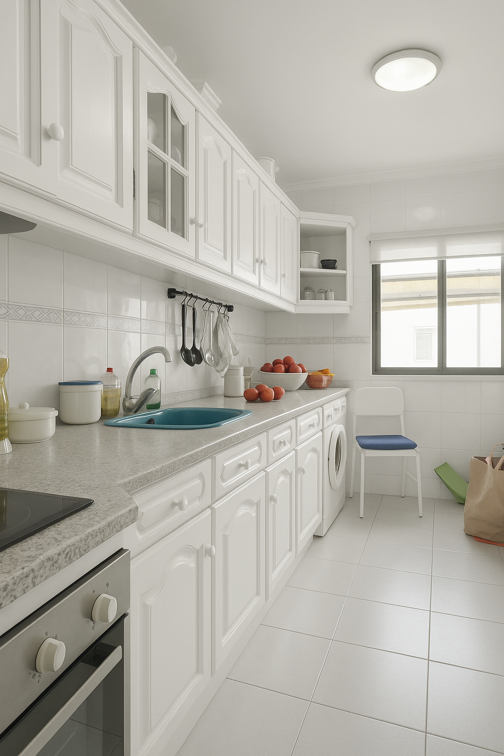 Queremos mudar para branco e remover a parte do móvel ao pé da janela para colocar o frigorífico