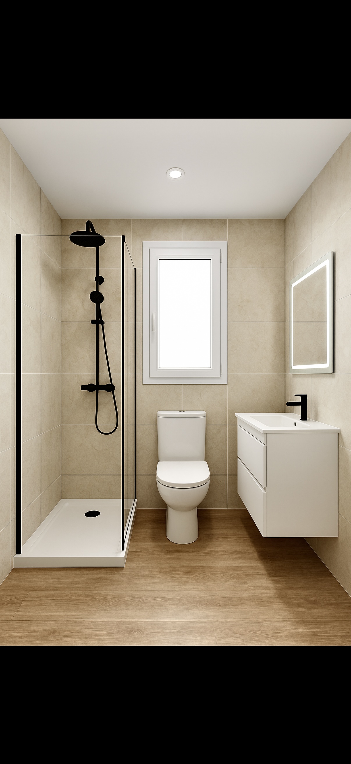• Parede oposta à porta (também 1,98 m): sanita Roca Mitos centrada ou ligeiramente deslocada conforme posição da base de duche e lavatório. O bidé seria removido para ganhar espaço. Colocar o espelho LED (60×80 cm) acima do lavatório.