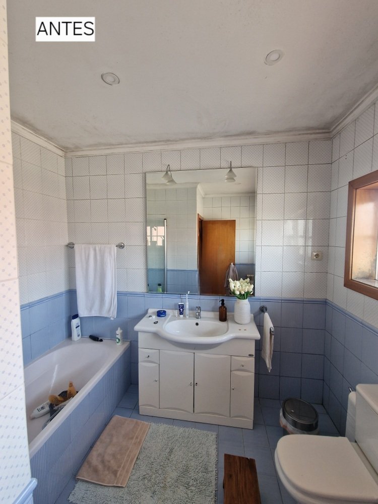 Esta casa de banho tem uma luz maravilhosa! E a ideia seria retirar a nossa banheira e substituir por um espaçoso chuveiro! Colocar um móvel suspenso largo para dar mais cumprimento a esta casa de banho e colocar uns rolos giros nas janelas para nos dar mais privacidade!