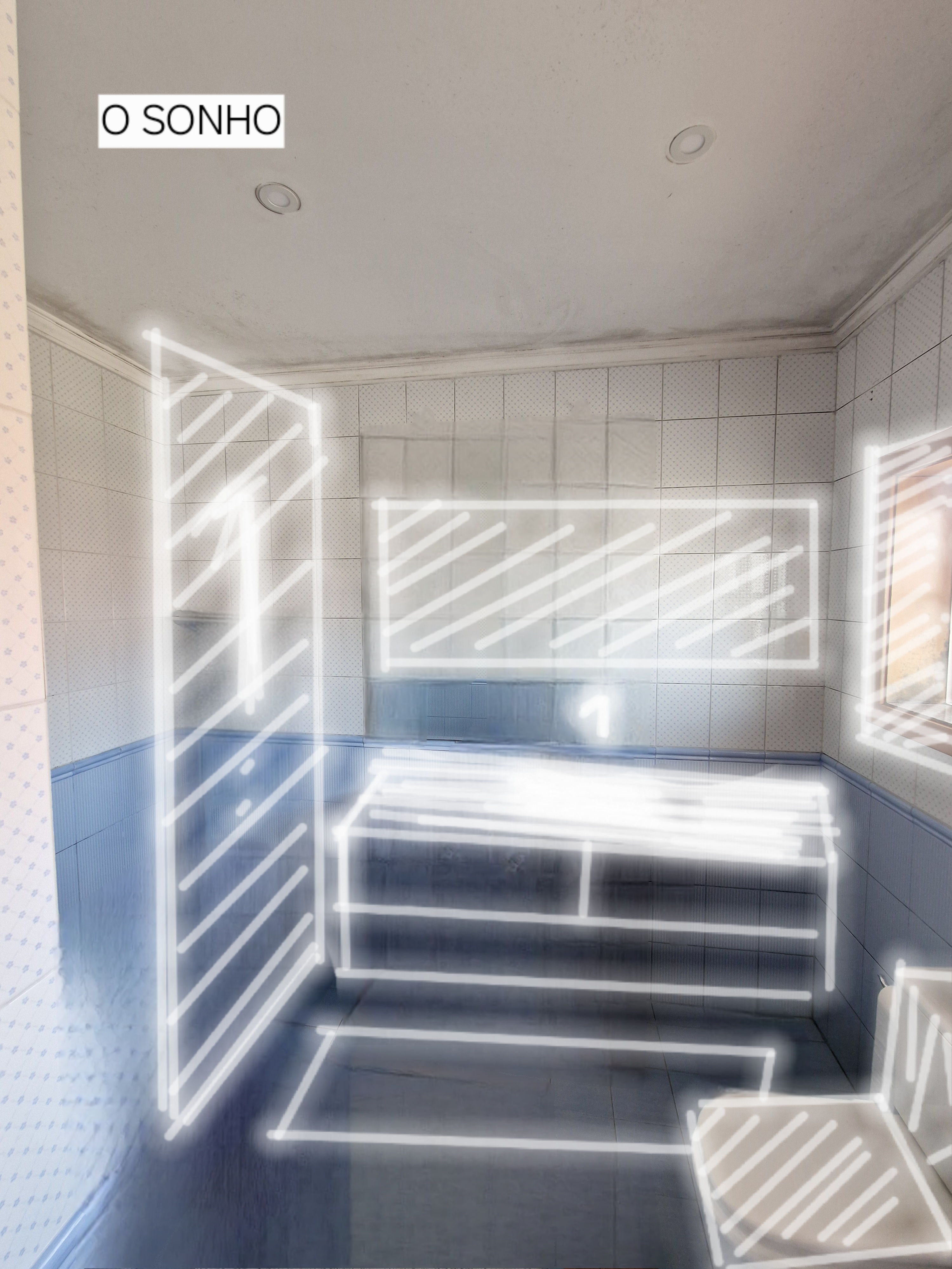 A ideia seria transformar esta casa de banho num oasis!! Primeiro trocar toda a ceramica!! Substituir por uma ceramica bege, leve e orgânica!